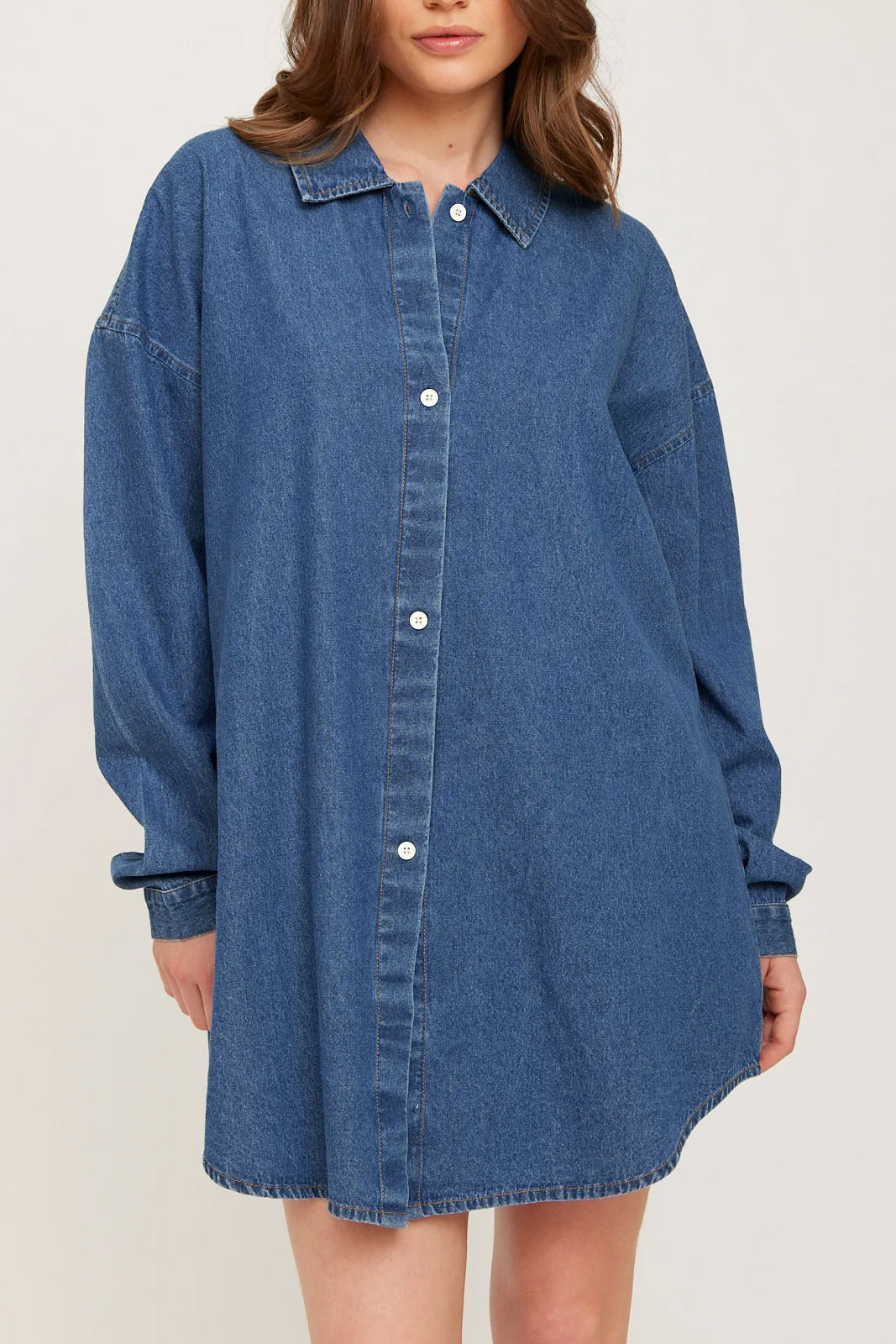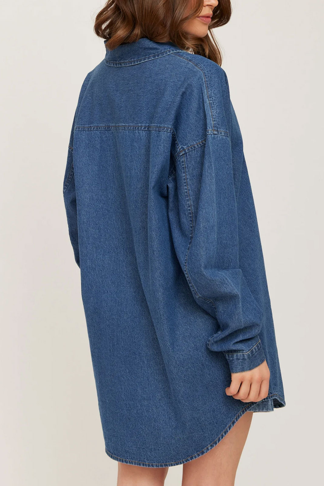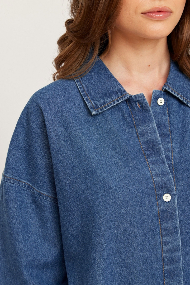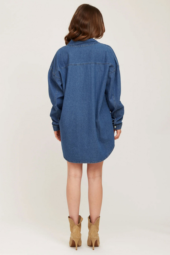 Denne dameskjole i denim fanges af tre klare detaljer: en klassisk krave, der giver struktur og en poleret fornemmelse, en firkantet manschette, der forstærker det minimalistiske look, og en praktisk knappelukning foran, der gør plagget nemt at style. Materialet er 100% bomuld, hvilket giver naturlig åndbarhed, blød fornemmelse mod huden og en holdbar, tidløs kvalitet, der ældes med stil. Den oversize-pasform gør det nemt at matche med et bælte for mere definition eller bære uden for et afslappet look.