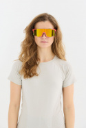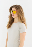- Sportbrillerne har et let halvramsdesign med spejlede polykarbonatglas og en bue af termoplastisk gummi og metal