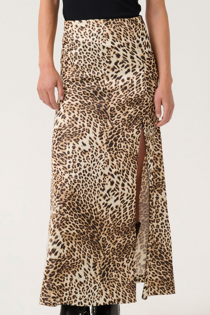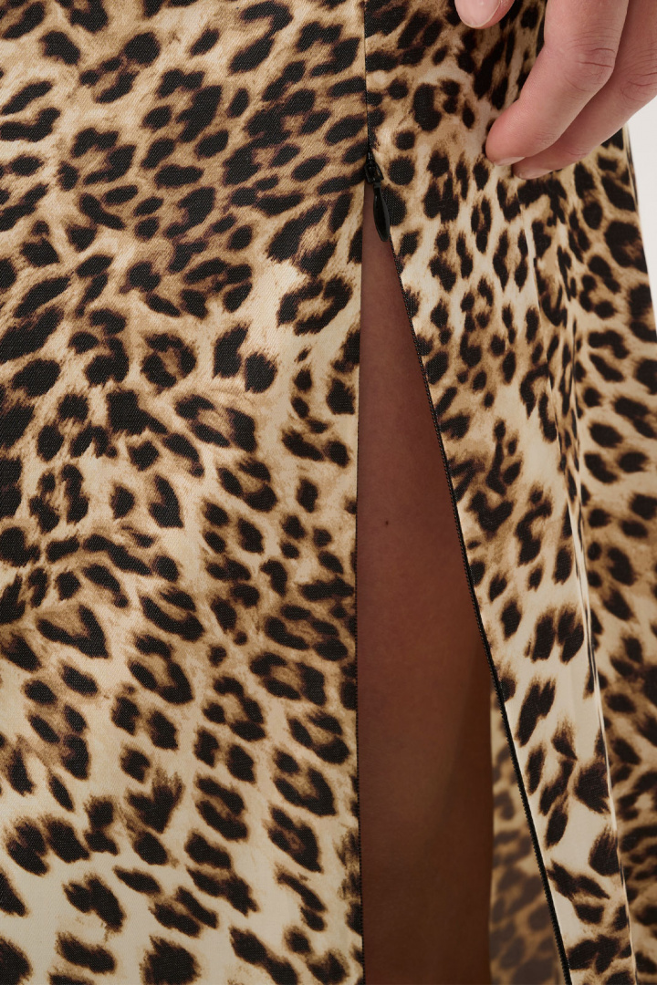 Gzleelo P Hw Kjole fra Gestuz er en leopardskøn kjole med normal talje og en ret pasform, der giver en moderne og selvsikker silhuet. Elastikken i taljen tilføjer en komfortabel hverdags- og weekendstil, samtidig med at den bevarer en pæn, jævn linje. En praktisk lynlås i siden gør på- og afklædning nemt, og slidsens detaljer med lynlås giver bevægelse og en subtil edge uden at fjerne fokus fra mønsteret.