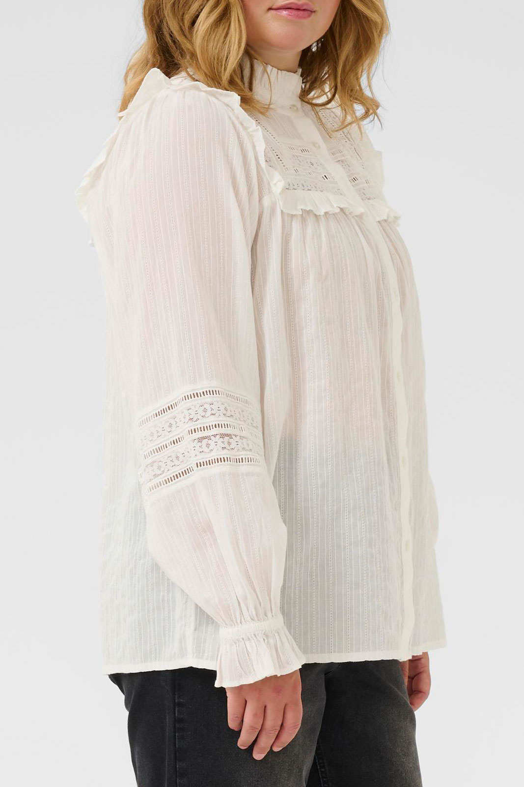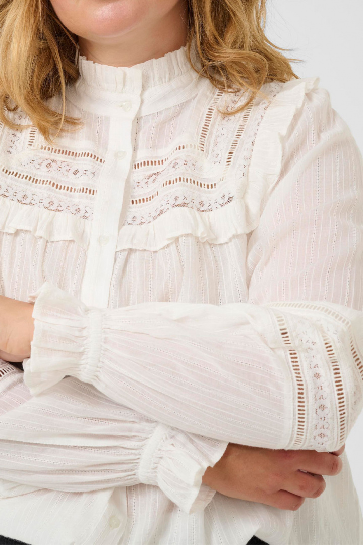 Kcjessa Shirt Bluse fra Kaffe Curve er en flot og komfortabel plus size-bluse i normal pasform, der passer til de fleste kropstyper. Den høje krave giver et elegant udtryk, og den praktiske knaplukning foran gør det nemt at style blusen efter sæson og lejligheder. Elastikken i ærmesluten skaber en praktisk og behagelig pasform, der holder formen gennem dagen, mens spidsdetaljerne tilfører en feminin og legesyg nuance uden at overdrive.