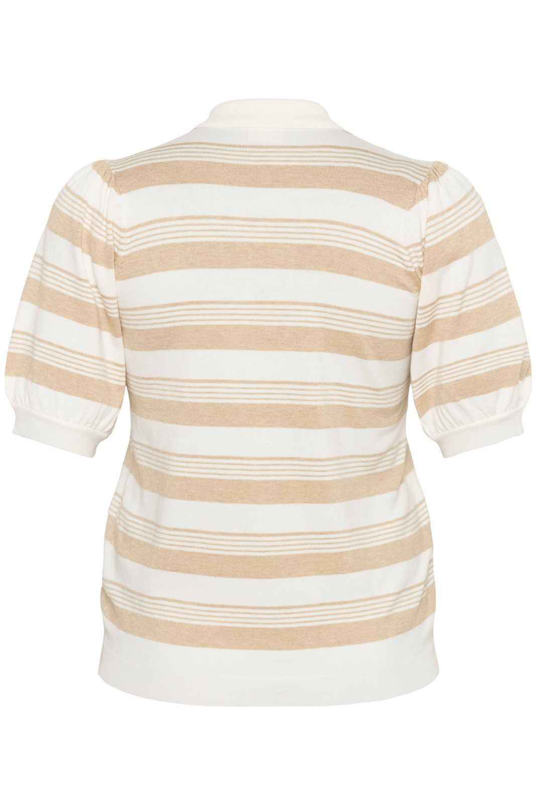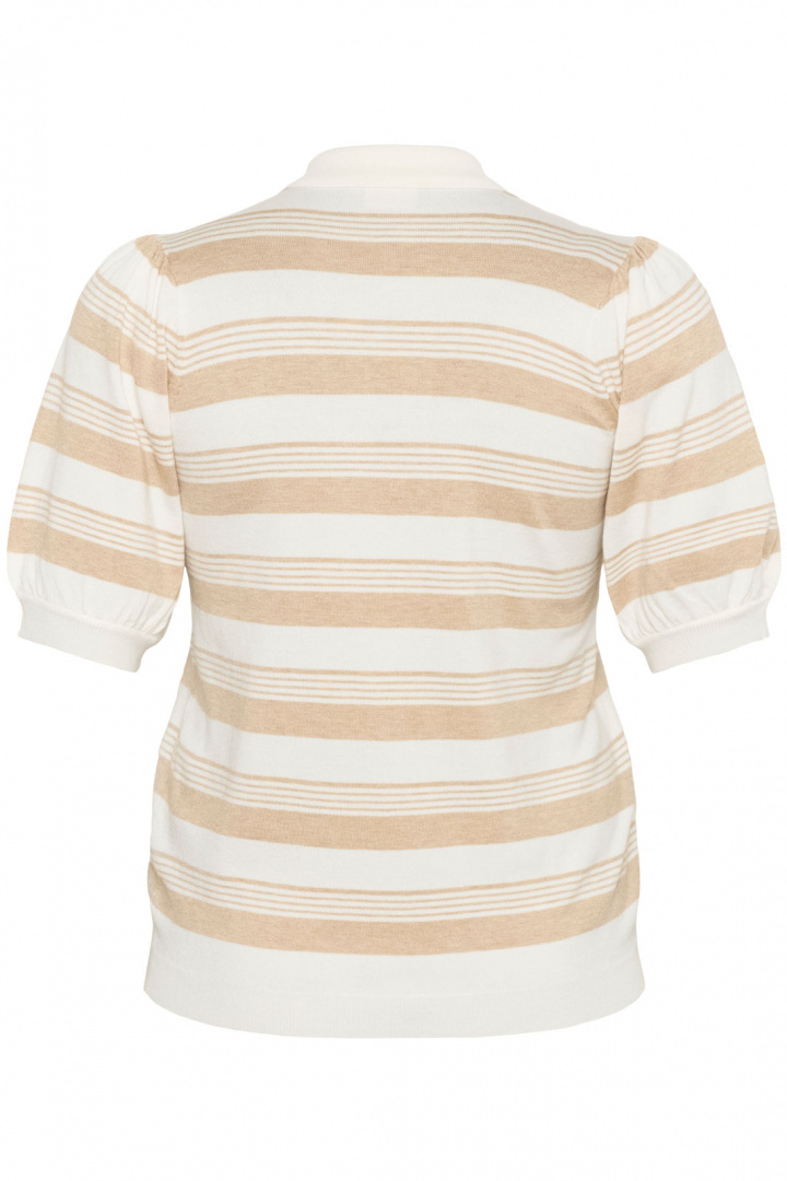 Trøjen er udstyret med en klassisk krave og en diskret knaplukning ved halsudskæringen, hvilket giver et tidløst og sofistikeret udtryk. De omhyggeligt placerede stribede detaljer tilføjer et stilrent touch, hvilket gør, at den nemt kan kombineres med både bukser og nederdele til forskellige anledninger - fra kontoret til weekendens aktiviteter. Ribstrik ved ærmerne og nederst giver ekstra komfort og sik