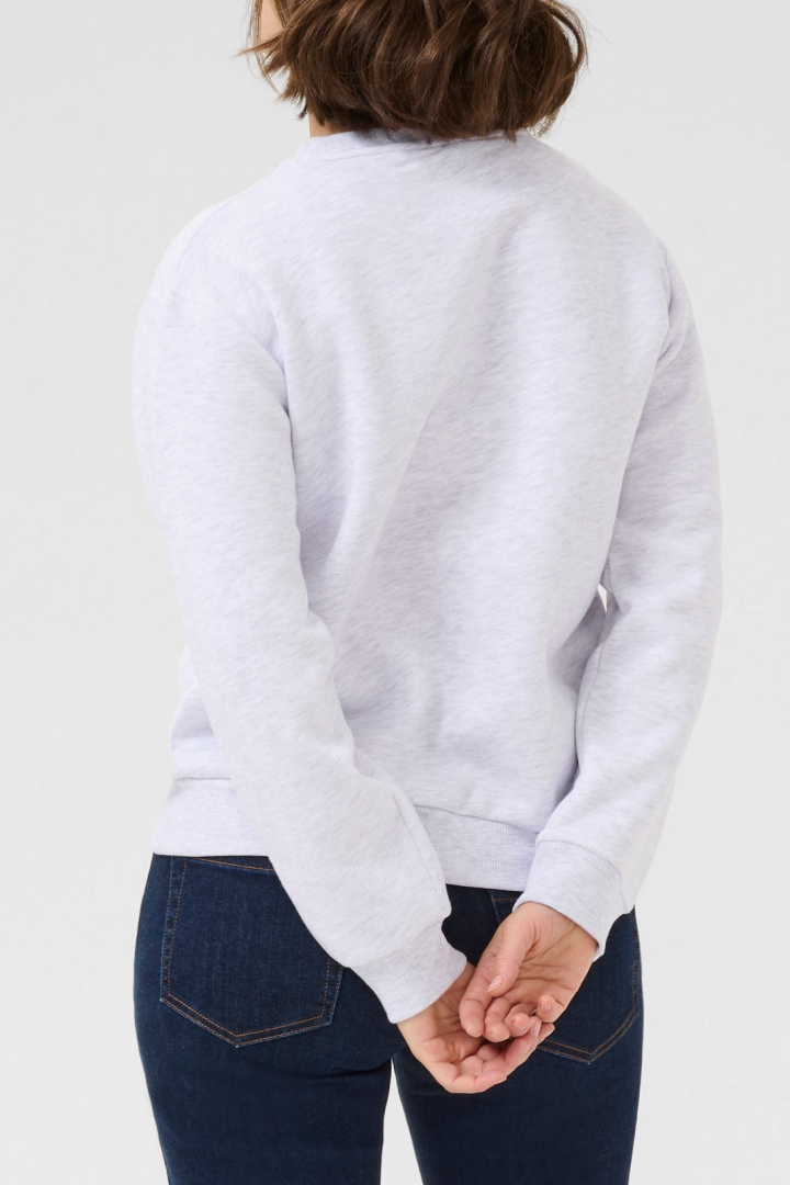 Materialet består af 85% bomuld og 15% polyester, hvilket giver en blød følelse mod huden samtidig med, at tøjet bevarer sin form og farverne vask efter vask. Denne sweatshirt er perfekt som basislag i hverdagsgarderoben - kombiner den med jeans for et afslappet look eller med nederdel og sneakers for en rolig, stilren stil.