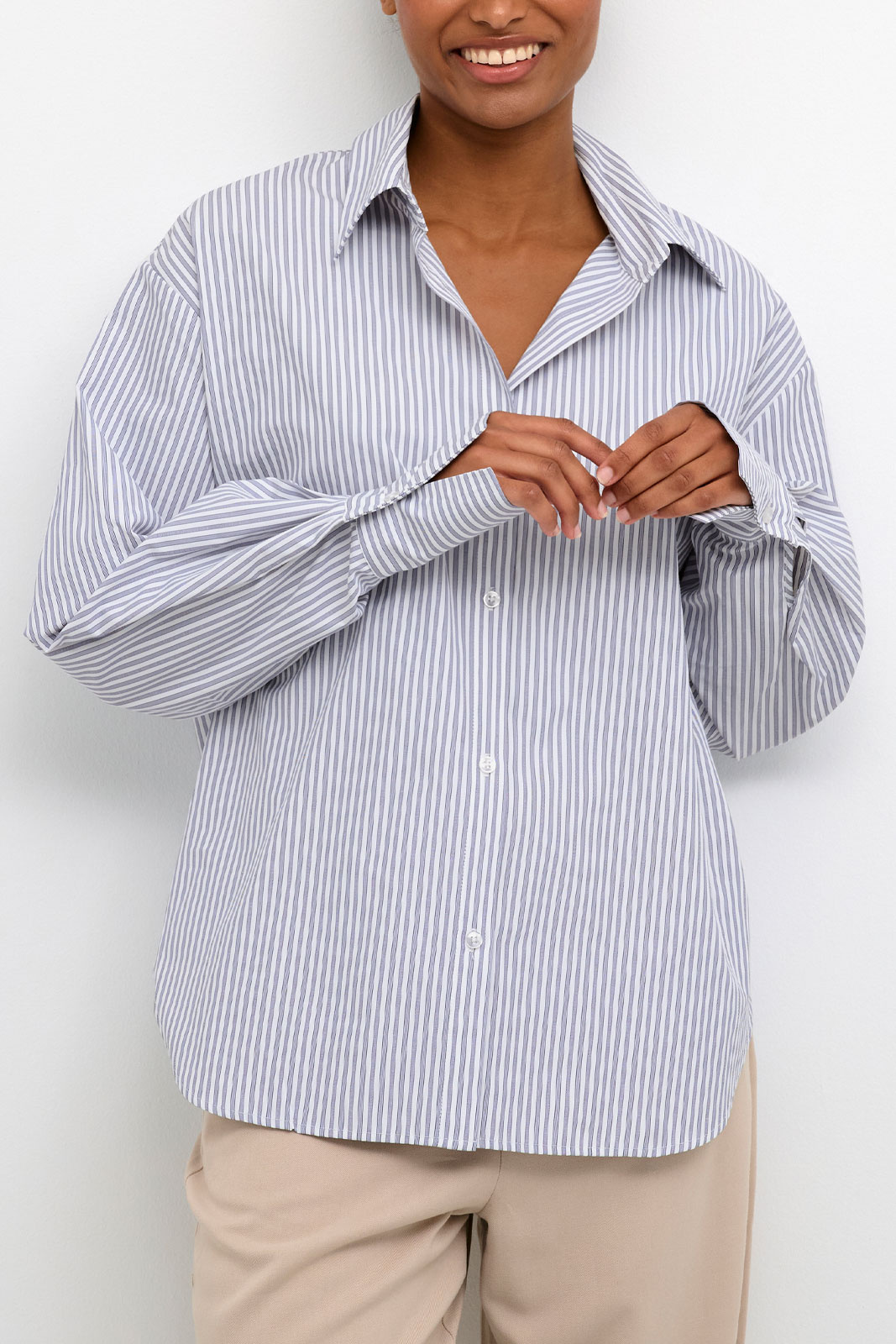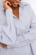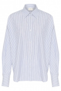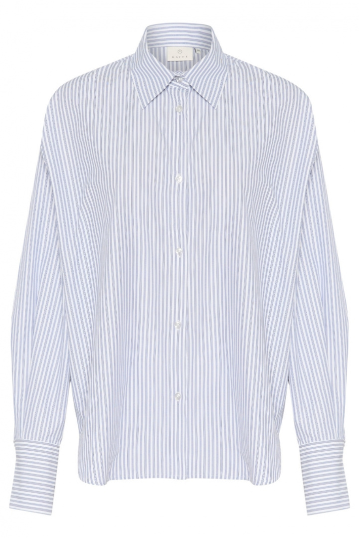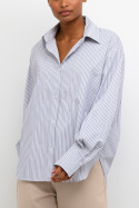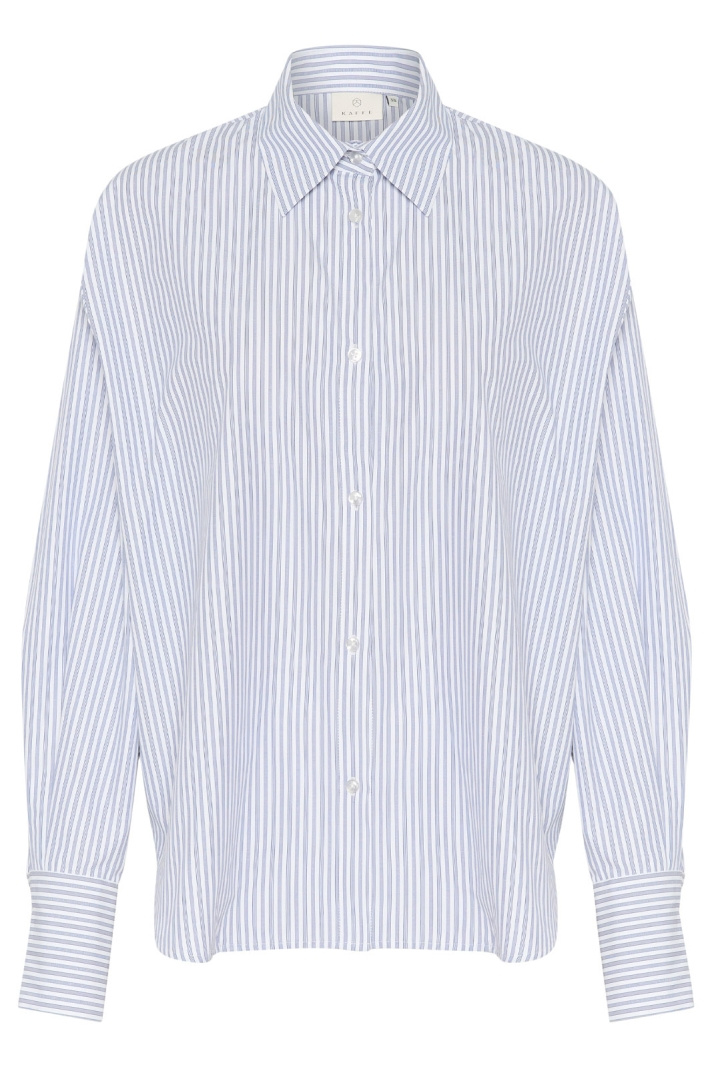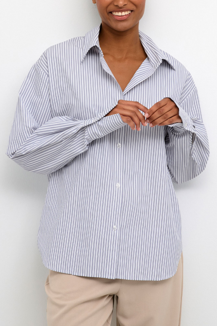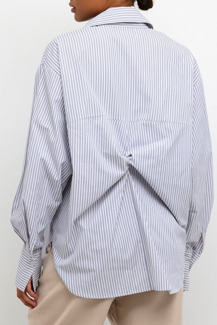 Kamaibritt Knot Shirt fra Kaffe er en stribet dam skjorte i løs pasform, som forener hverdagskomfort med et stilrent, moderne udtryk. Den klassiske krave og den firkantede manchet giver et tidløst look, mens den for det meste gennemknappede front holder silhuetten flot og enkel. En diskret detalje bagpå giver tøjet en unik karakter uden at overdrive, hvilket gør skjorten til et selvfølgeligt element i en alsidig garderobe. Den stribede overflade gør det nemt at matche med både jeans for et afslappet look og mere formelle bukser eller en nederdel til arbejde eller festlige lejligheder.