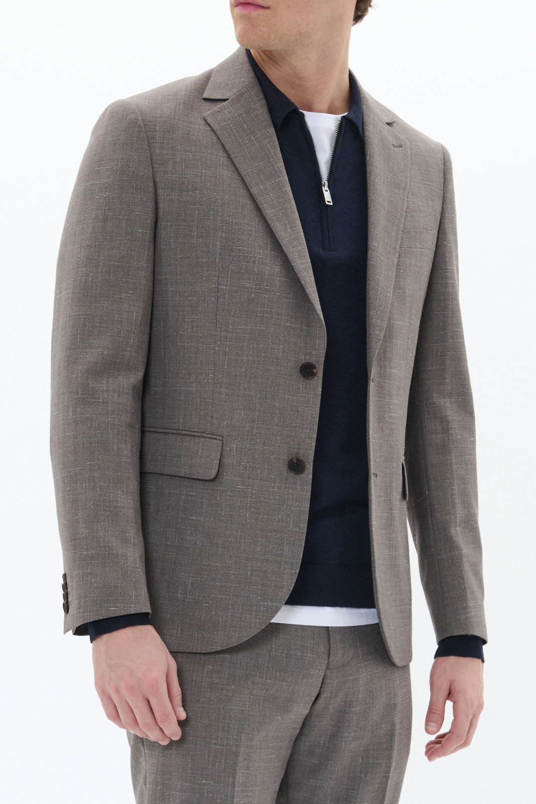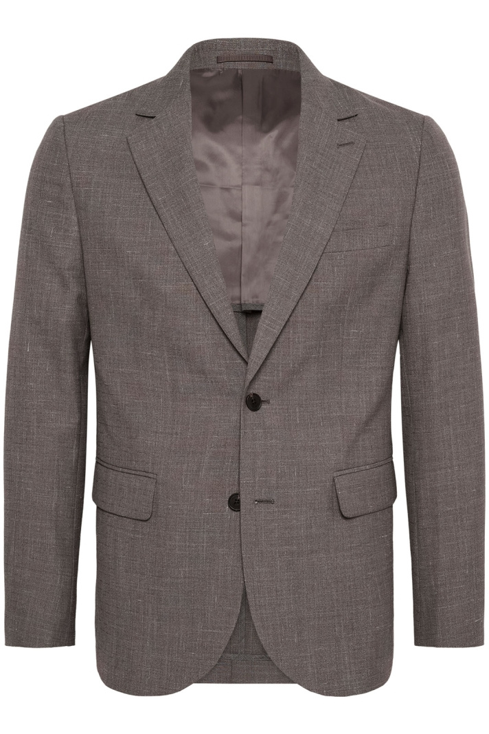 På indersiden venter et helt polyesterfor, der gør det nemt at tage kavajen af og på, samtidig med at det bidrager til lang holdbarhed og formstabilitet. Ytmaterialet består af en smagfuld blanding af uld, polyester og hør - 40% uld, 50% polyester og 10% hør - som giver et tekstureret, fremtrædende look med god slidstyrke og lethed. Den åbne brystlomme giver plads til et næseklæde eller små detaljer, mens to lommer med klap holder dine ting sikre uden at bryde den rene, stilrene front.