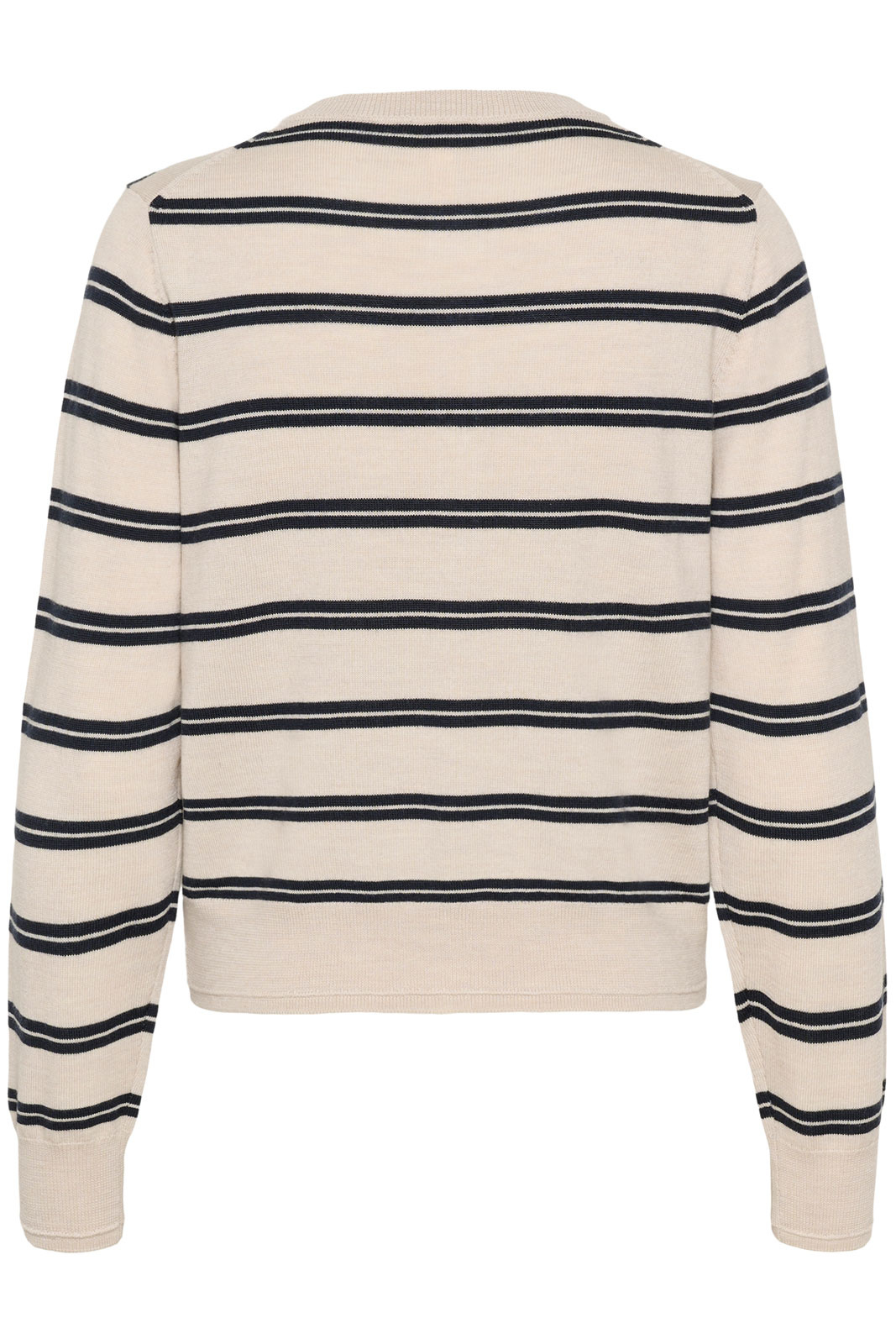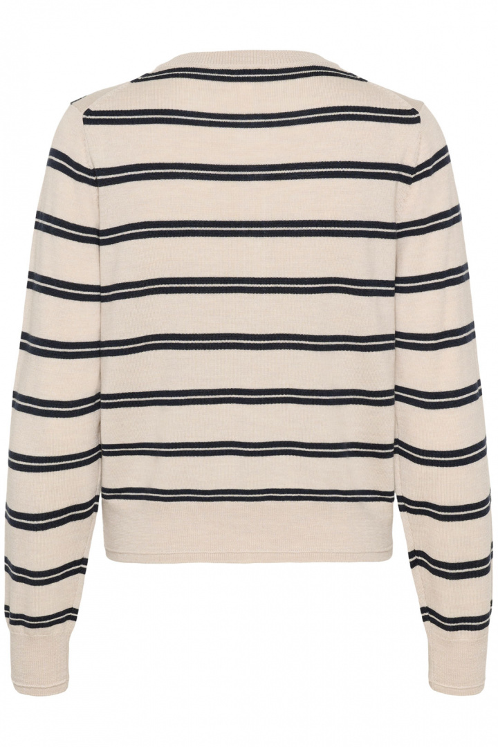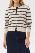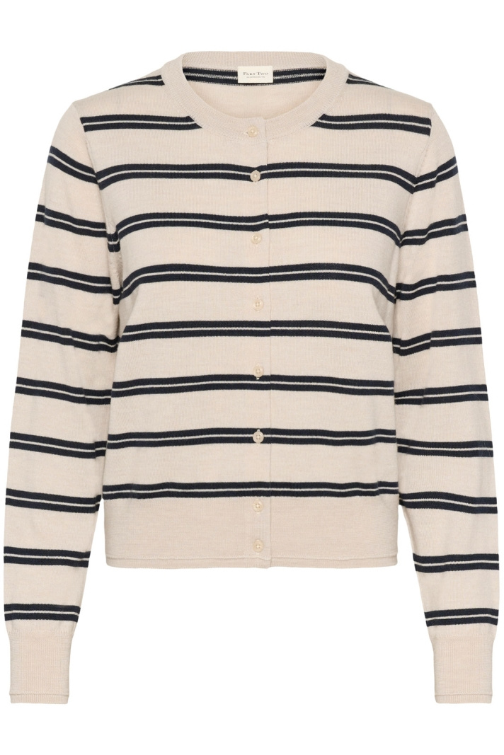 Noelanipw Cardigan bluse fra Part Two er en tidløs stribet cardigan i normal pasform, der passer lige godt til hverdag som til en lidt mere opklædt stil. Den runde halsudskæring giver et blødt, indbydende udtryk, og den praktiske knaplukning foran gør det nemt at variere stilen efter anledning. De stribede, finstrikkede detaljer fanger opmærksomheden uden at være overdrevne, mens ribkanterne i krave, ærmeslut og i bunden giver en klassisk ribbet finish og hjælper tøjet med at holde formen sæson efter sæson.
