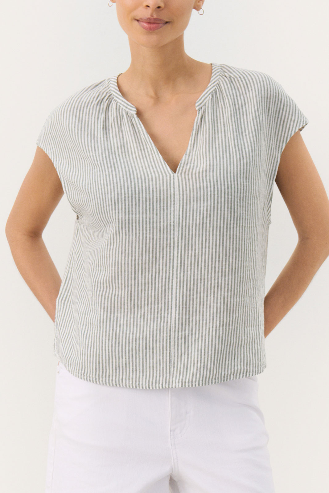 Fremstillet i en behagelig 50/50-blanding af hør og viskose giver blusen både åndbarhed og blød drapering. Hør bidrager til kølighed og komfort på varme dage, mens viskosens bløde fornemmelse giver et flot fald, der rammer kroppen pænt uden at føles stiv. Denne kombination gør Reynapw Bl særligt alsidig: Klæd den op med en nederdel eller skræddersyede bukser for et poleret look, eller stylet den casual med jeans for en afslappet stil, der stadig ser gennemtænkt ud.
