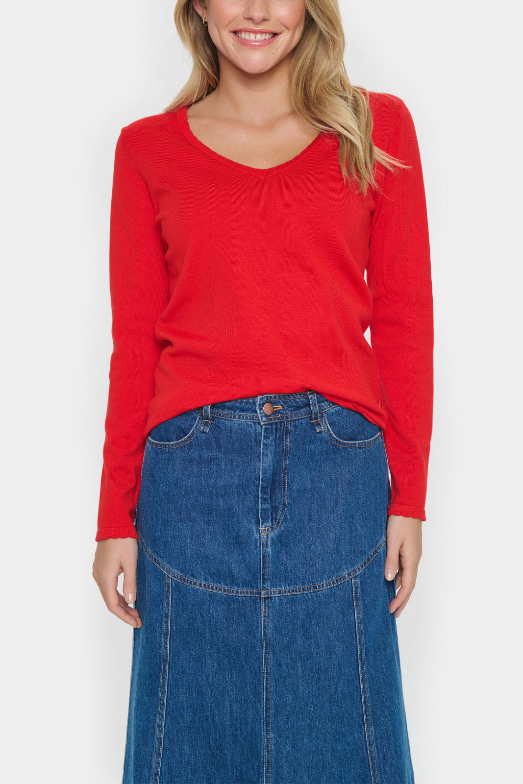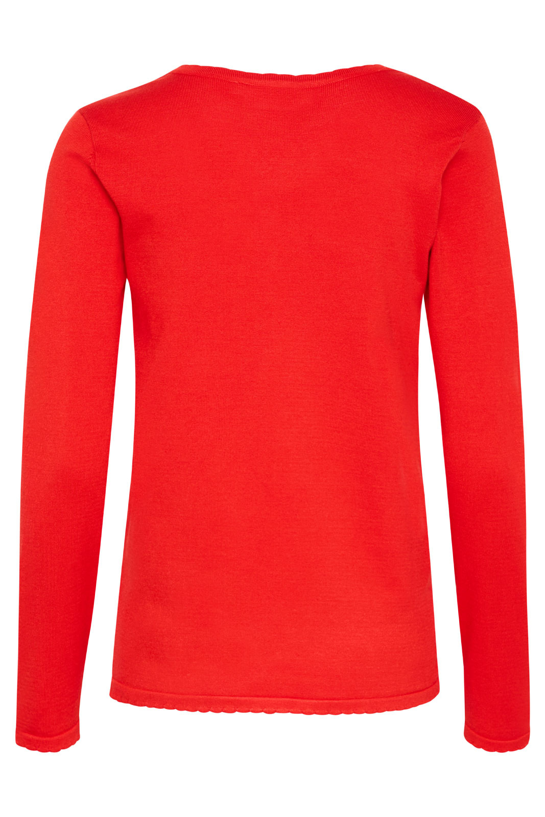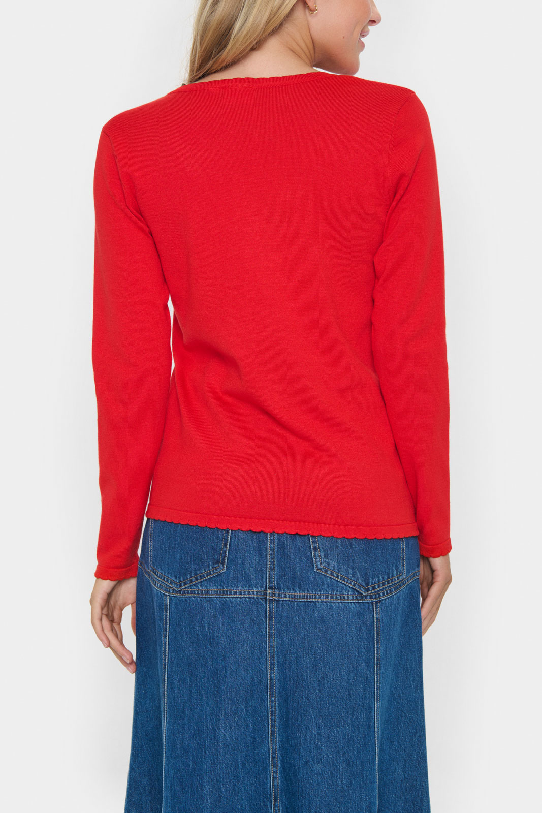 - Dekorativ, bølget kant ved halsudskæringen, i ærmernes manchetter og i nederkanten