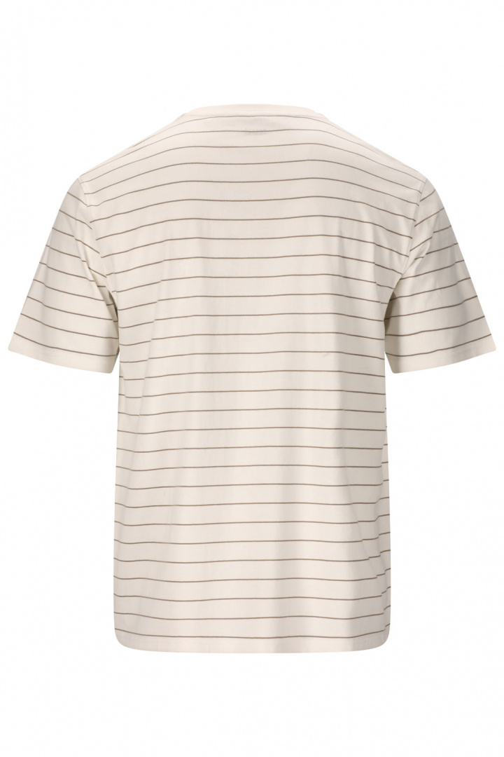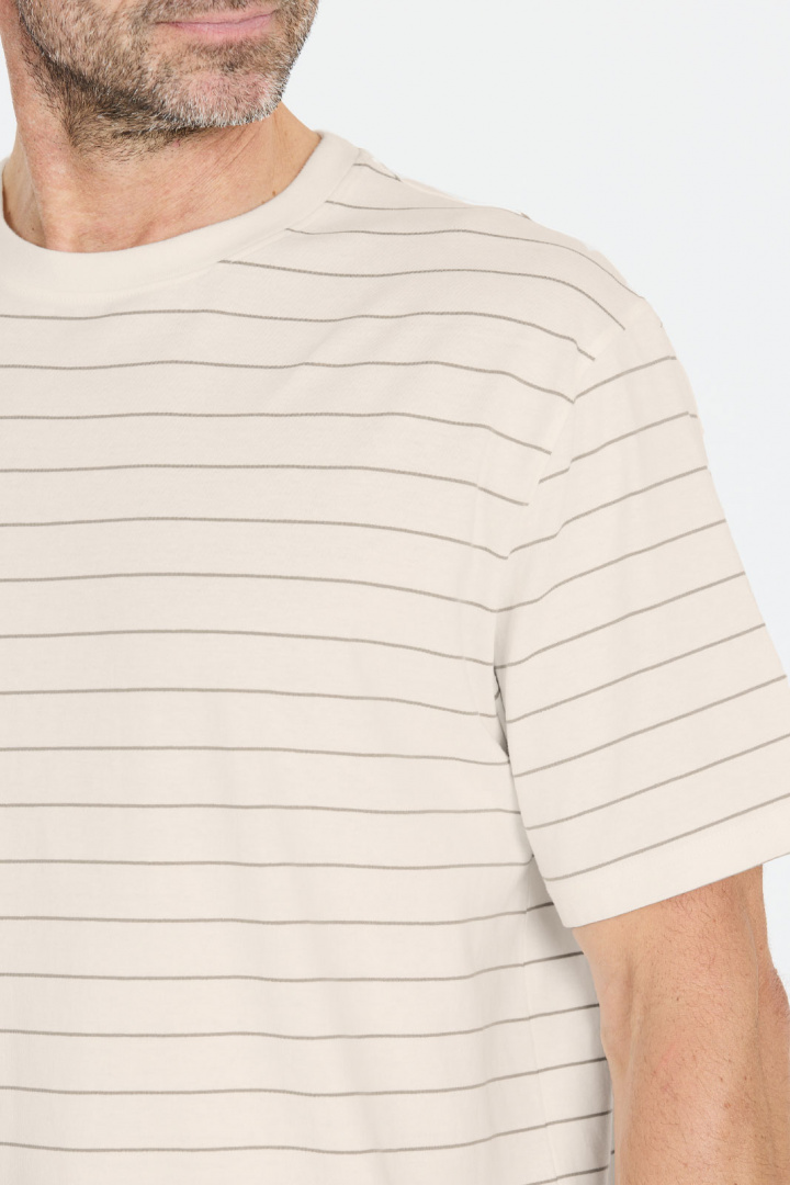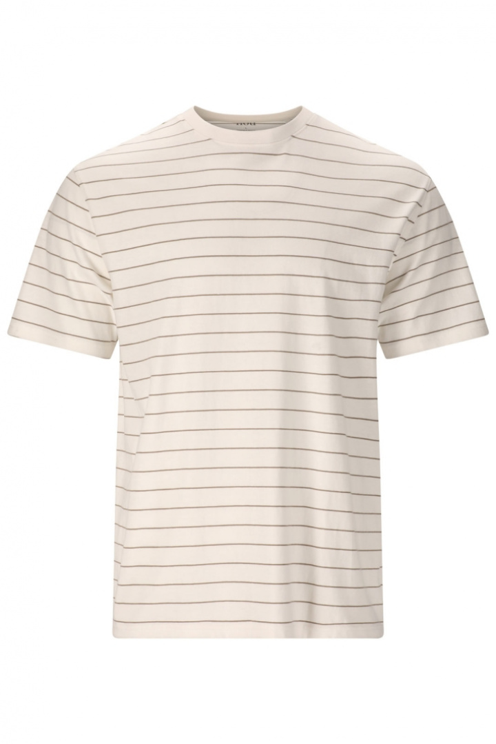 Siddall M Striped Tee T-Shirt fra Nou er en herre-t-shirt i stribet design, der kombinerer tidløs stil med behagelig hverdagskomfort. Den har normal pasform med en afslappet følelse, rund halsudskæring og et tydeligt stribet look, der gør den let at matche - perfekt til jeans, chinos eller shorts. Fremstillet af 100% bomuld føles den blød mod huden og tilbyder åndbarhed hele dagen. Det enkle, rene design gør, at den passer til mange forskellige stilarter og anledninger, samtidig med at de stribede detaljer giver en sporty, men stadig klassisk følelse. Vælg Siddall M Striped Tee for et pålideligt basisplagg, der tilbyder komfort, kvalitet og et stilrent, let matchende look.