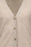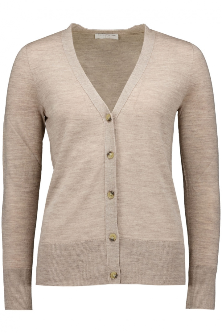 Ruby Rws S68915 Trøje fra Tiger Dame er en damestriktrøje i normal pasform, der elegant sætter tonen i garderoben. Den V-halsede halsudskæring sammen med den praktiske knaplukning foran gør den nem at style åben eller lukket, og ribkanterne i kraven, ærmeslutt og forneden giver en solid, behagelig pasform. Den fint strikkede struktur giver et sofistikeret touch, der passer lige godt til hverdag som til lidt mere pyntede outfits.
