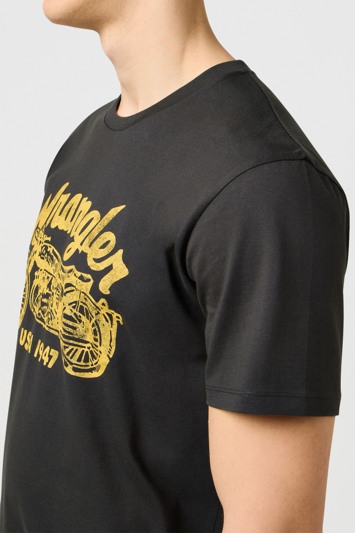 Selv om Wrangler primært er kendt for deres jeans, har de et udvidet sortiment. Du kan matche dine jeans med en Wrangler T‑shirt med tryk. De bliver ofte inspireret af tidsperioder som 70'erne, og det kommer til udtryk på trøjer og T-shirts.
